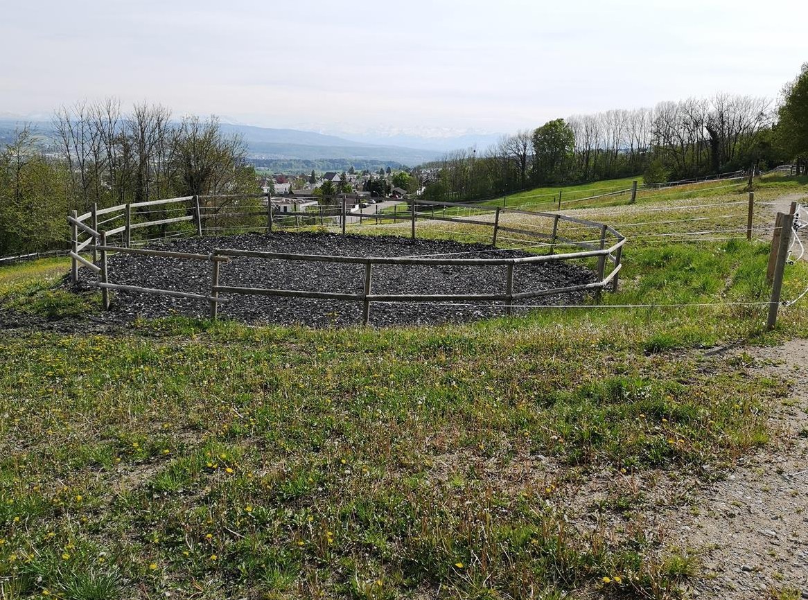 Offenstall für Freizeitpferde auf einer Anhöhe.