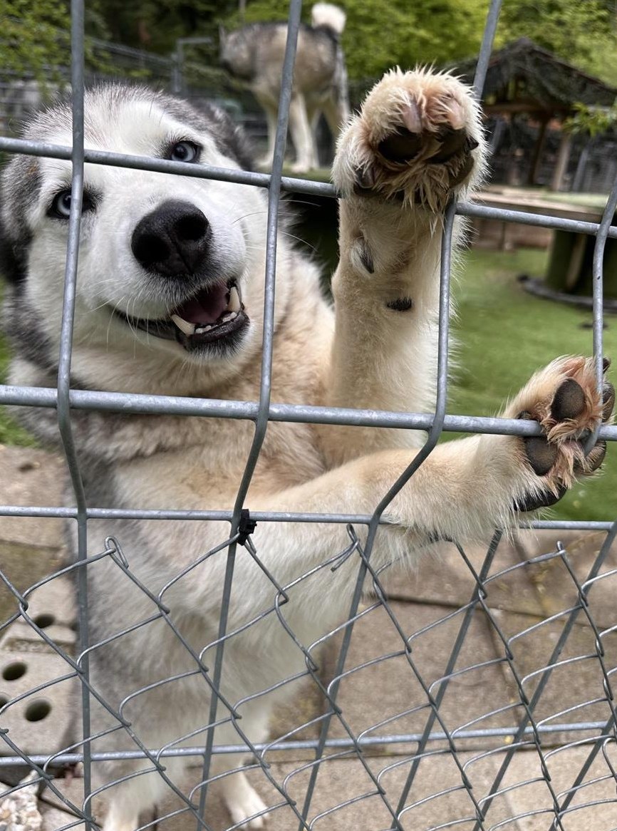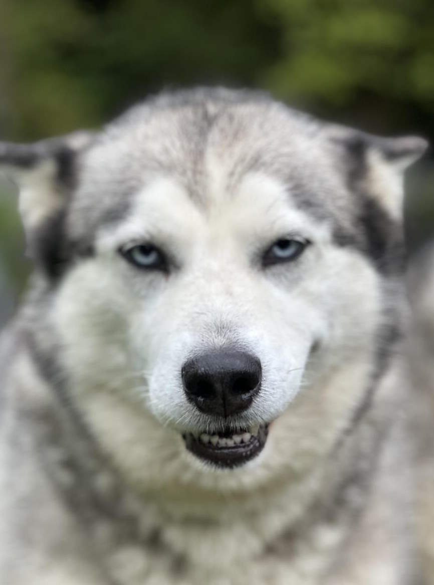 Husky Hündin mit klarem Blick und offenem Wesen. Die Hündin kennt das Leben im Haus, ist anhänglich, verschmust und freut sich über jede Form von Zuwendung. Spaziergänge mag sie sehr – an der Leine zieht sie etwas, wie es für ehemalige Zughunde typisch ist, doch die Husky Hündin bewegt sich sicher, souverän und freundlich im Alltag.