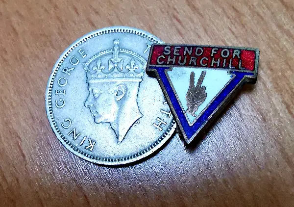 Diese Anstecknadeln wurden offenbar zur Unterstützung von Winston Churchills Wiederwahlkampagne in den 1950er Jahren hergestellt. Diese Anstecknadel hat noch die originale Befestigung und ist mit einem Copyright-Vermerk versehen. Die rot-weiss-blaue Emaille scheint in gutem Zustand zu sein, und diese kleine Anstecknadel wird Sammler begeistern.