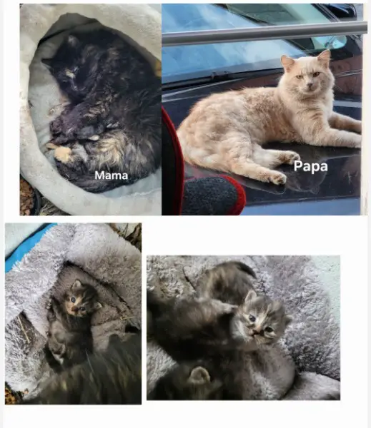 Maine Coon Mischling. Beide sind sehr ruhige Charakteren, Miauen praktisch nie und sind sehr menschenbezogen und unsportlich. Auch wir, wie man sieht werden wie unsere Eltern langhaarig. Wir fressen bereits und putzen uns. Menschenmama bevorzugt, dass wir zusammen bleiben dürfen, ideal wäre ca mitte Juli. Man kann uns natürlich vorher auch mal besuchen kommen. Unserer Menschenmama ist die richtige