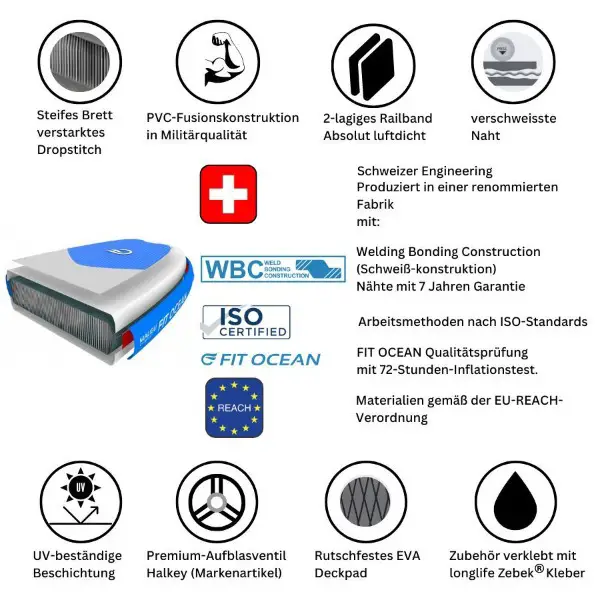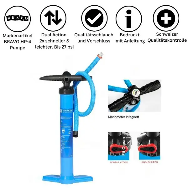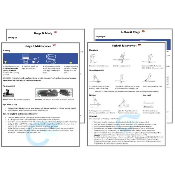 Inklusive (komplettes Set) : Hochwertige Pumpe mit Double / Single-Action-Modus für schnelles und komfortables Aufpumpen; Grosser Rucksack mit neuen, besonders bequemen, gepolsterten Trägern; Slide-Finne, Wartungswerkzeuge, Englisches und deutsches Handbuch mit Einricht-, Wartungs-, Technik- und Sicherheitstipps + gratis Leash (Fussleine) .