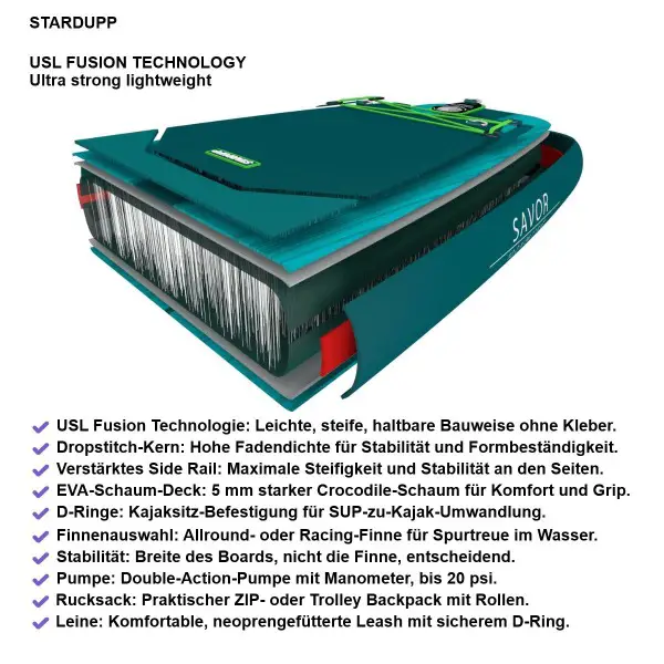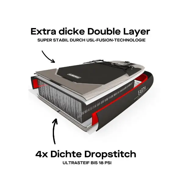 Der Stardupp Earth ist Teil der Elite Serie. Alle Stardupp Elite SUP Boards werden mit Hilfe der Double Layer USL Fusion Technologie hergestellt, was zu Boards führt, die in Gewicht, Steifigkeit und Haltbarkeit überragend sind. Da der thermische Fusionsprozess ohne Klebstoff erfolgt, wird das Gewicht drastisch reduziert, während die Materialfestigkeit, Steifigkeit und Haltbarkeit erhöht werden. Diese Elite SUP Boards können einen höheren Druck und ein höheres Traggewicht (Gewicht an einem Punkt) tragen.