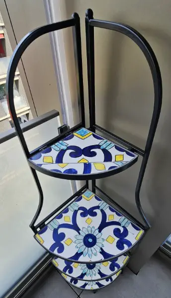 Eckregal klappbar 4 Ablagen. Struktur aus für den Aussenbereich behandeltem Stahl (E-Coating) und mit epossidischer Pulverbeschichtung. Bretter aus Keramik. Klappbar.