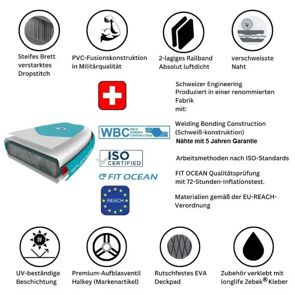 Rucksack, Flossen, Wartungsset, Schnalle, um das aufgerollte Board zu verpacken und einfach in einen Rucksack zu laden, Schutzstreifen, um die Flossenbox ein Leben lang gerade zu halten, englisches und deutsches