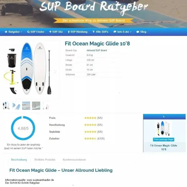 Das „Magic Gliding“ wird durch die flache Nase erreicht, die dem Board eine angenehme Geschwindigkeit von bis zu 8 km/h auf längeren Strecken verleiht und eine einfache Navigation im Geradeauslauf ermöglicht. Die 81 cm (32 Zoll) Breite in Verbindung mit dem breiten Vorderteil (Nose) sorgt für eine beeindruckende Stabilität, insbesondere im Vergleich zu anderen Marken mit spitzen Bugbrettern, die oft als wackelig empfunden werden.