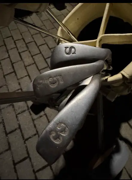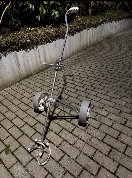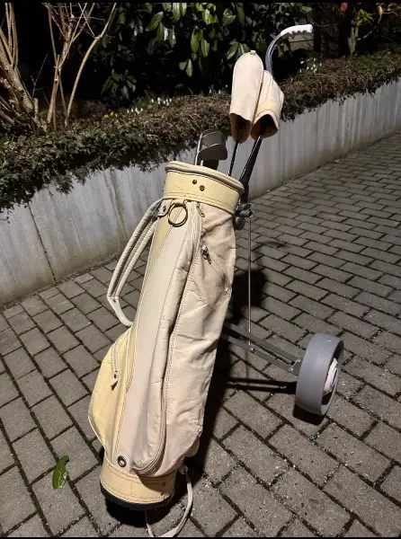 mit fünf Schlägern und einem Wägelchen, das zusammengeklappt werden kann. Mit Gebrauchsspuren. Ohne Umtausch, von privat, ohne Gewährleistung und nur zur Selbstabholung.