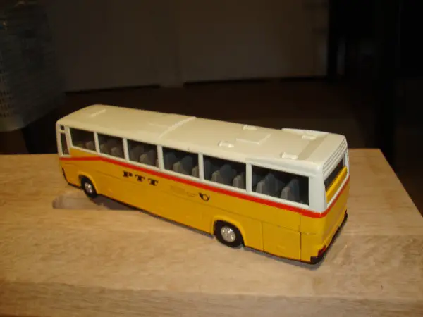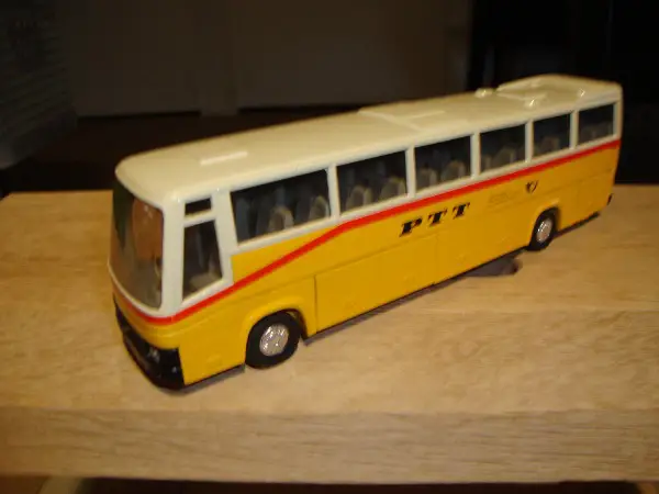 Verkaufe ein älteres Postauto PTT VolvoCoach aus Metall im Massstab 1:50 mit den Massen: Länge 24cm Breite 5cm Höhe 7cm die Einstiegstüre und einige Gepäckfächer seitlich können geöffnet werden. Dieses Postauto ist in einem guten zustand Vorauszahlung zuzüglich 8.50 Versand.