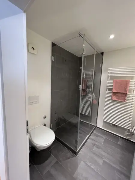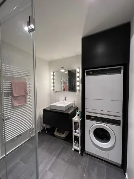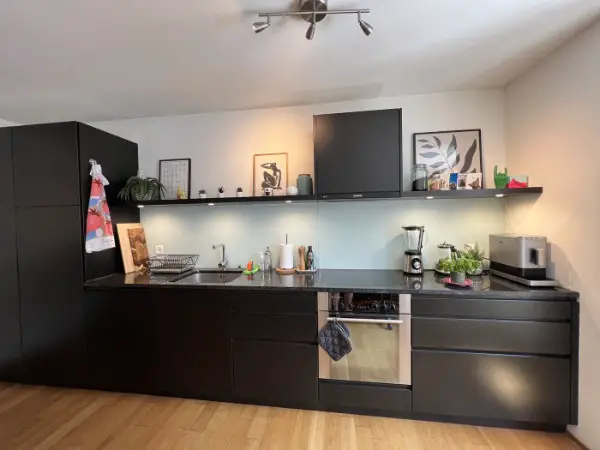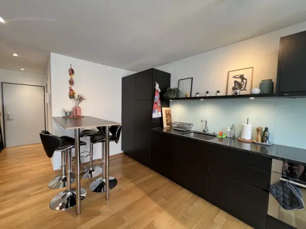 Die Wohnung ist renoviert und verfügt über eine moderne Küche und ein geräumiges Badezimmer mit Dusche sowie integrierter Waschmaschine und Trockner. Die Küche ist mit einem Kühlschrank, Backofen, Herd und Geschirrspüler ausgestattet. Der Esstisch ist eingebaut und Teil der Wohnung. Ein kleiner Nebenraum bietet Stauraum. Zwei grosse Fenster im Hauptraum und ein kleineres im Nebenraum sorgen ganztägig für Tageslicht und morgens für Sonnenlicht.