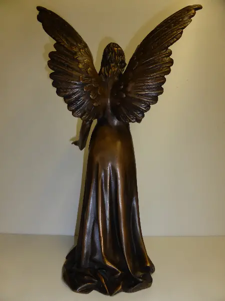 Bronzefigur Engel mit schöner Patina in seltener Grösse von ca. 45 cm Höhe und einem Gewicht von ca. 9 Kg. Leichte Gebrauchsspuren. Signiert gemäss Bild.