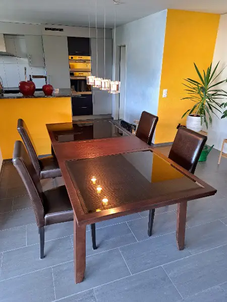 Qualitativ hochwertiger Esszimmertisch, 2-mal um je 40 cm leichtgängig ausziehbar beidseits mit Kugellagern besetzt.