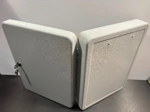Schrank aus solidem Eisen in hellgrauer Lackierung inkl. vier Bohrungen für einfache Montage an