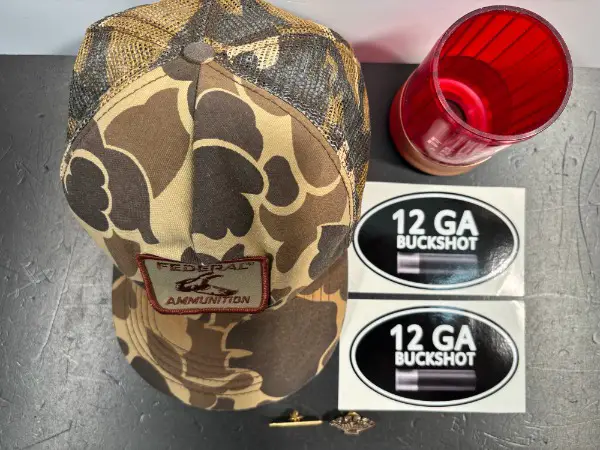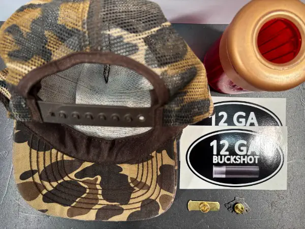 Mütze - Käppi in stark gebrauchtem Zustand // 2x AnsteckPins // 2x Sticker 12GA Buckshot aus solidem PVC - Vinyl in der Grösse 12cm x 7cm