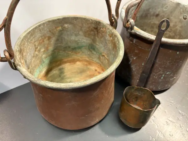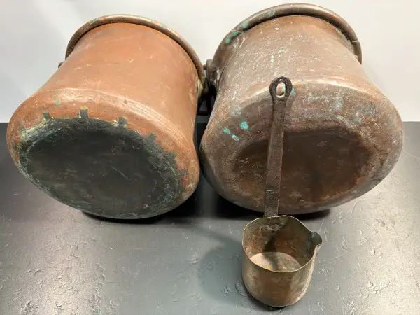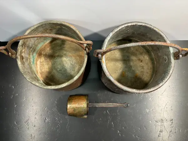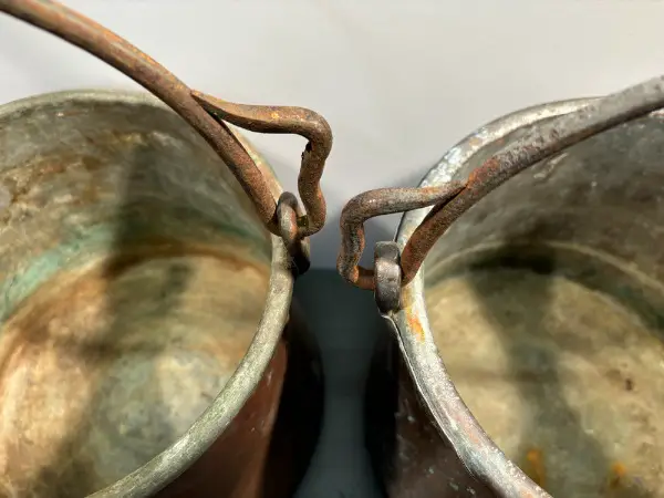 Set mit zwei gleichen KUPFERKESSEL mit geschmiedeten Schmiedeeisen Henkel Griff für Dekoration oder Garten // eine urchige Deko für