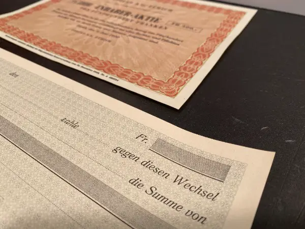Bank Handel Postkarten Geld Zeitzeugen Briefmarken Ansichtskarten Briefmarken antike Dokumente Münzen Gold Silber seltene Erden Wertanlage Banknote Godlvreneli etc. // Grösse der Aktie ca.: L 210mm x 150mm
