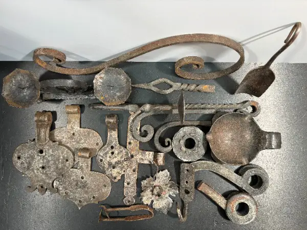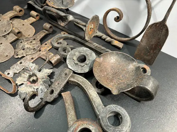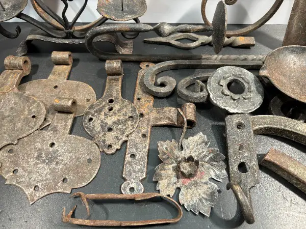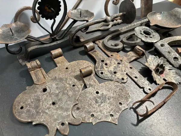XXL Konvolut Lot diverse geschmiedete Schmiedeeisen alte Konsole Haken Schaufel Verzierung Kerzenleuchter Aschenbecher Türbänder Zange Rosette etc. // aus Werkstatt Garagenräumung - Platzmangel // für Dekoration SideBoard Alphütte Rustico Wohnzimmer Vitrine Stall Vintage ShabbyChic Schmied Schreiner Beschläge Riegel Tor Esse Amboss Metallbau Berghaus Schlosser Schmiedeeisen Landhaus DoItYourself Burg Ritter Metall geschmiedet Kommode Heimwerker Gartentor Bauernschrank antike Truhe etc. // Die Scharniere sind und vermutlich 250 - 400Jahre alt // Gewicht ca. 7KG