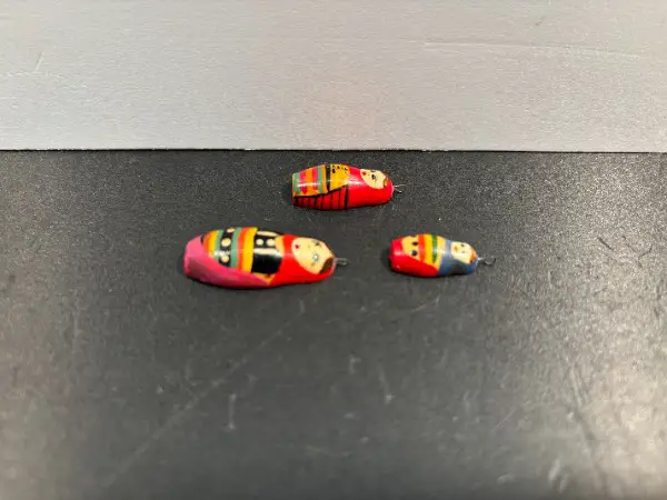 3x kleine Babuschka Figuren aus Russland Sowjetunion UDSSR in sehr gutem Zustand aus Holz handbemalt und lackiert mit Ösen aus Metall zum aufhängen etc. // Dekoration für das Wohnzimmer Sammlung Vitrine Sideboard Kommode Gang Esstisch Kunst Schnitzereien Holzarbeit Künstler Skulptur Figur Objekt Antiquitäten etc. // aus sehr gepflegtem NICHTRAUCHERHAUSHALT ohne TIERE! // Masse der grössten über alles Figur ca.: H 3.2cm x B 1.4cm x T 0.7cm
