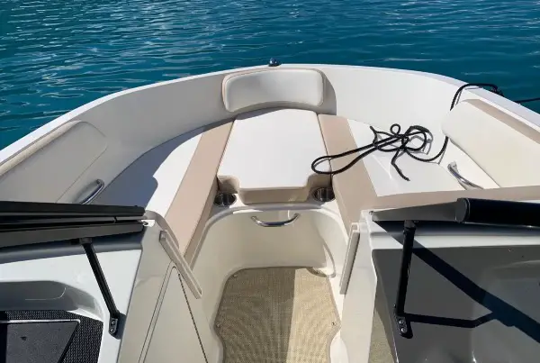 Back-to-back Sitze, Einzelsitze vorn, Bimini-Top, Hafenpersenning, Batterie, Batterie-Hauptschalter, Badeplattform, Hecktür zur Badeplattform, Badeleiter, Bilgepumpe, Bilgepumpe elektrisch, Feuerlöscher, Feuerlöscher-Anlage,
