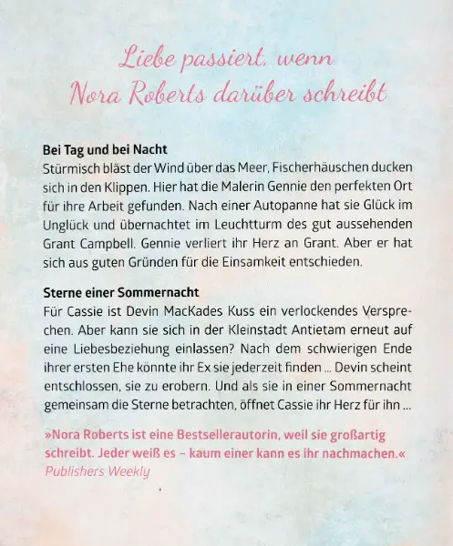 Autorentext Nora Roberts wurde 1950 in Maryland geboren. Ihren ersten Roman veröffentlichte sie 1981. Inzwischen zählt sie zu den meistgelesenen Autorinnen der Welt: Ihre Bücher haben eine weltweite Gesamtauflage von über 500 Millionen Exemplaren. Auch in Deutschland erobern ihre Bücher und Hörbücher regelmässig die Bestsellerlisten. Nora Roberts hat zwei erwachsene Söhne und lebt mit ihrem Ehemann in Maryland.