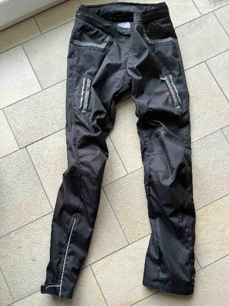 Motorradhose FASTWAY (Grösse 50) . Atmungsaktiv, wind- und wasserdicht. Weitenregulierung an Taille und Saum durch Klett. Verbindungsreissverschluss. Entnehmbare Protektoren an den Knien. Einrichtung für seitliche Protektoren. Entnehmbares Innenfutter.