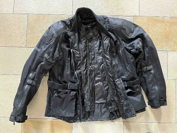 Motorradjacke COURSE (2XL/56) . Textiljacke. Mehrere entfernbare Lagen. Wasserdichtes und thermisches Futter. Diverse Aussen- und Innentaschen. Verstellbare Taille, Handgelenke und Ärmel. Stretcheinsätze für gute Passform. Verstärkte Stellen.