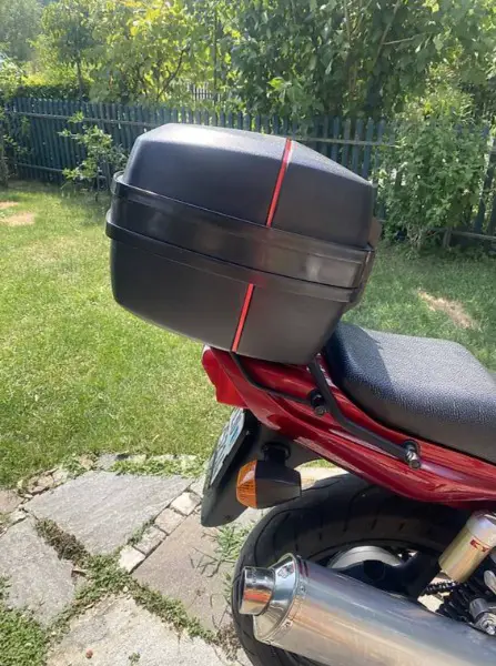 Tankrucksack (Top-Zustand) , abschliessbarer Helmkoffer fürs Heck, Original-Auspuff (nahezu neuwertig) .