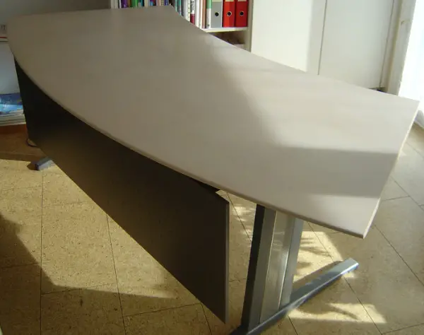 Schreibtisch sichelförmig geschwungen, Länge aussen 235 cm / Länge innen 165 cm x Tiefe 90 cm in Ahorn-Echtholzfurnier hell, 2 Füsse Metall pulverbeschichtet anthrazit, Sichtblende