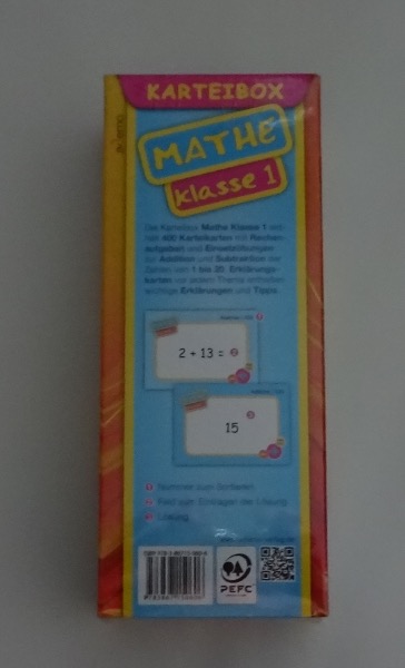 Auf jeder Karte ist auf der Vorderseite die Rechenaufgabe dargestellt, die Ihr Kind lösen soll. Auf der Rückseite ist die richtige Lösung aufgeführt. Um zu verhindern, dass sich Ihr Kind nur die Reihenfolge der Karten einprägt und die Aufgaben an Hand dessen richtig löst, empfehlen wir Ihnen, die Karten immer wieder zu mischen. Mit Hilfe der Nummern am rechten oberen Kartenrand können Sie die Karten immer wieder nach ihrer ursprünglichen Reihenfolge sortieren. In der Karteibox befinden sich zusätzlich 5 Registerkarten, unter denen Sie die Karten ablegen können. Diese Kontrollmöglichkeiten verschaffen Ihnen einen umfassenden Überblick über den Kenntnissstand und die Lernfortschritte Ihres Kindes und gewährleisten, dass das Gelernte wirklich richtig sitzt.