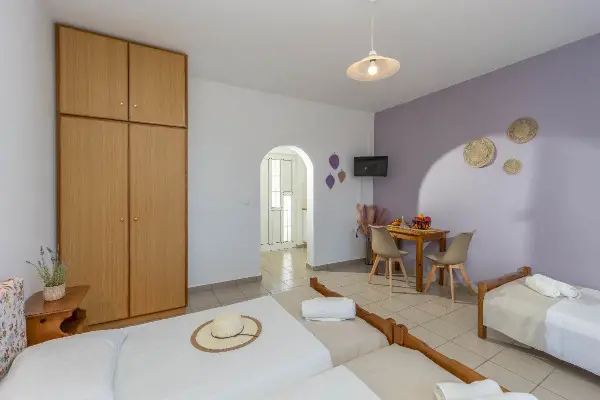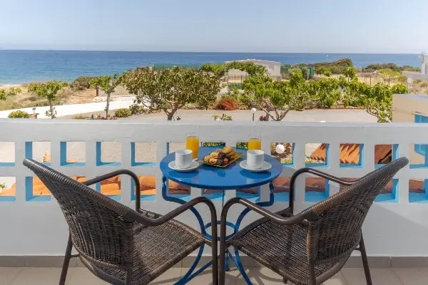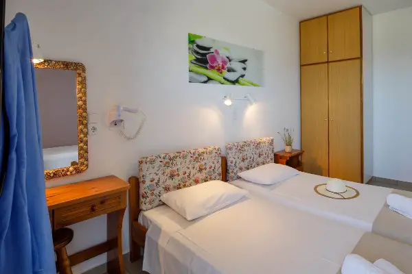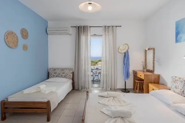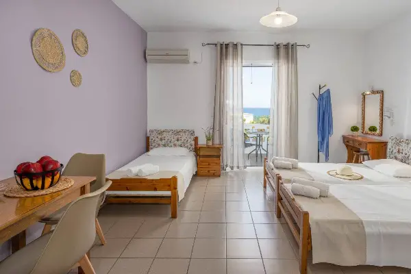 Vier kleine Ferienwohnungen für 2 bis 3 Personen (jeweils 28qm) mit Kitchinette, Badezimmer mit Dusche, Schlafzimmer mit Doppelbett und/oder Einzelbetten, Fernseher und mit Klimaanlage - direkt am Meer.