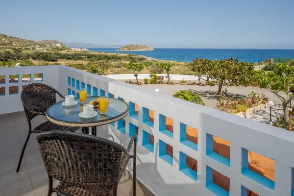 Die Ferienwohnungen haben Balkon oder Terrasse mit Blick auf das Meer und fast über die ganze Bucht bis hin zu einem markanten Felsen und nach hinten hinaus einen herrlichen Blick in die Berge.