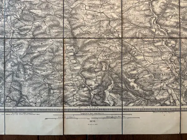 Ein HIGHLIGHT für Sammler oder für ein Collage oder für in Bilderrahmen Vitrine Alphütte Rustico Maiensäss Büro Wohnzimmer etc.: alte Landkarte - Topographische Karte um 1838 von KÖNIGREICH WÜRTEMBERG - Blatt Nr. 12 Ellwangen // VERLAG UNBEKANNT da KEINE ANGABEN AUFGEFÜHRT aber folgende Vermerkung: Red. von Zinstag & Kaiser gez. v. Schieber & Dürrich, Lith. von Fleischmann & Rebmann // mit den Ortschaften wie Ellwangen Adelmannsfelden Sontheim Stimpfach Hohnharde Crailsheim Lorenzenzimmern etc. // Material Papier auf Stoff // die Karte ist dem alter entsprechend in einem sehr guten Zustand weist aber minime Lagerspuren wie minime Flecken, Abnutzungen oder ähnliches auf // ein faszinierender Einblick wie Deutschland vor langer Zeit ausgesehen hat ... // für Fans und Sammler von Atlanten historischen Karten Zeitgeschichte Atlas Geographie Rustico historische Dokumente Schule Ausbildung Kartograhphie Globus Weltkarte Stich Lithographie SAC Schweizer Alpenclub Bergsteigen Swiss Topo Wanderung Alpen Berge etc. // Masse der Karte geöffnet ca. 56cm x 56cm, gefaltet ca. 19cm x 11cm