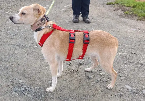 Hunde erhalten ein Sicherheitsgeschirr bei Ausreise.