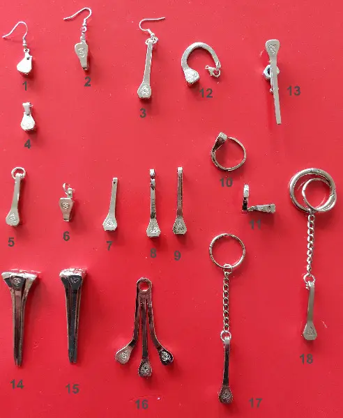 aus Hufnägel, Ohrringe, Anhänge, r Ringe, Broschen,