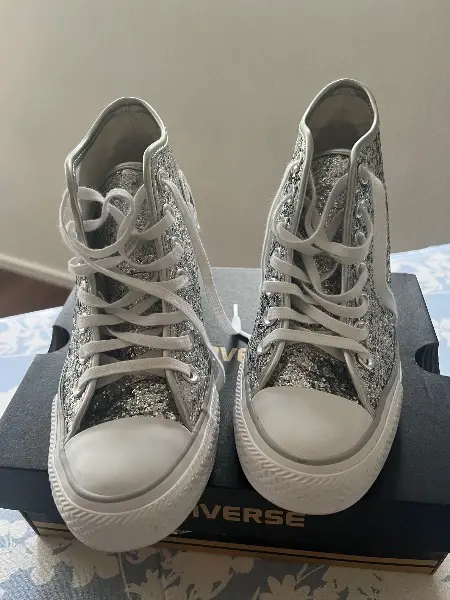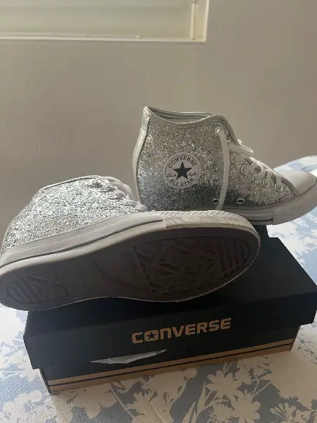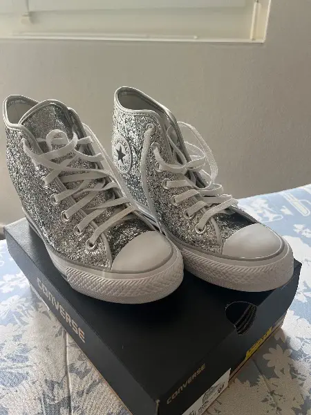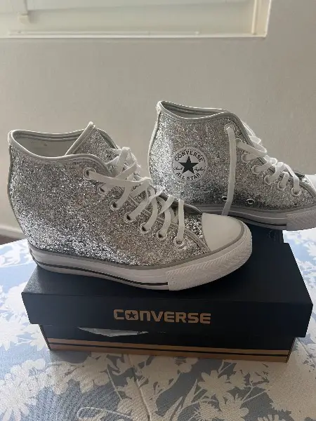 Keil Absatz ca. 7 cm Neuwertige Converse ALL STAR in Silber. Grösse 36