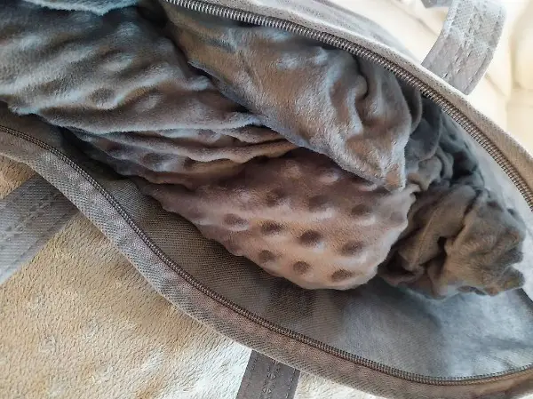 Die mit Glasperlen gefüllte Baumwolldecke (Innen) sowie dem kuschelweichen Minkyfleece Bezug (Aussen) . Die kleinen, geräuschlosen Glasperlen sind in rechteckige Quadrate im Innenbezug eingenäht.