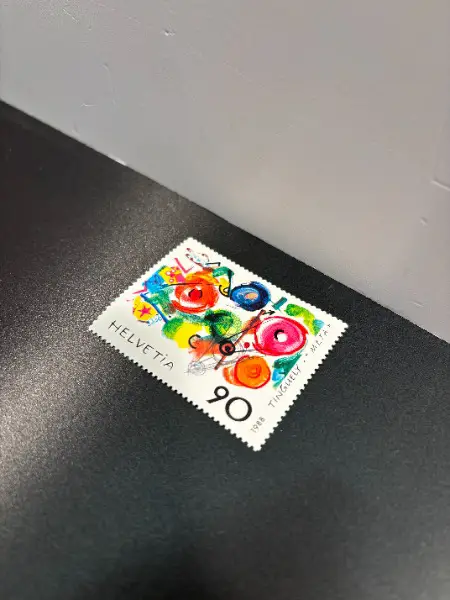 Maler Bildhauer JEAN TINGUELY - Fribourg - Schweiz zur NATIONALEN BRIEFMARKENAUSTELLUNG 1988 der schweizerischen POST PTT mit Sujet abstrakte Malerei // aus gepflegtem NICHTRAUCHERHAUSHALT von der zürcher Goldküste // für Sammler von Sondermarken Philatelie Briefmarken Markenbogen Sonderdruck Zeitzeugen Sonderbrief historischen Dokumente