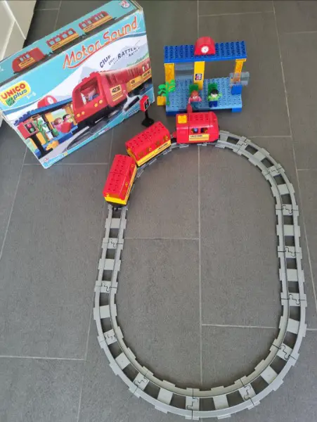 Elektrischer Zug mit Sound von Unico. Gleise verlegen, Zug zusammenbauen, gelben Knopf auf dem Dach des Lokführers drücken und schon setzt sich der Zug von selbst in Bewegung! Erstellen Sie einen Bahnhof, an dem die Passagiere einsteigen können.