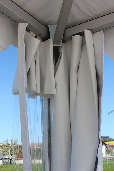 Beide Seitenwände haben mittig einen starken Reissverschluss, sodass die Wand auf beide Seiten zum Eckbein weggeschoben werden kann. Ideal bei sonnigem und warmem Wetter.