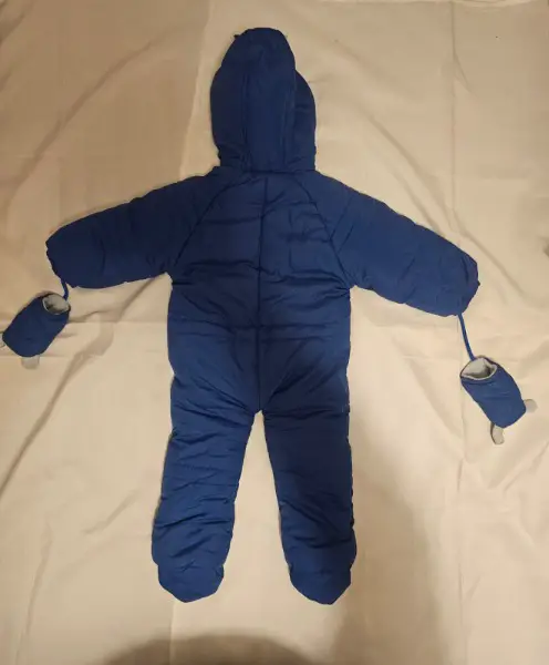ist blau und hat eine Kapuze und Fäustlinge, ideal für Spaziergänge im Schnee oder Ausflüge in der kalten Jahreszeit. Praktisch, warm und bequem perfekt für Ihr Baby!