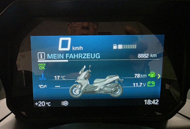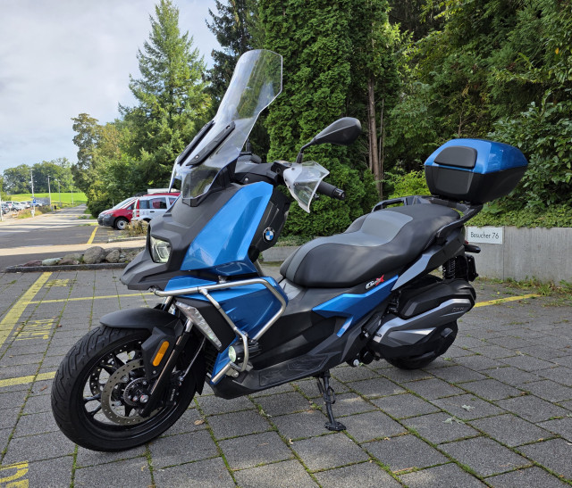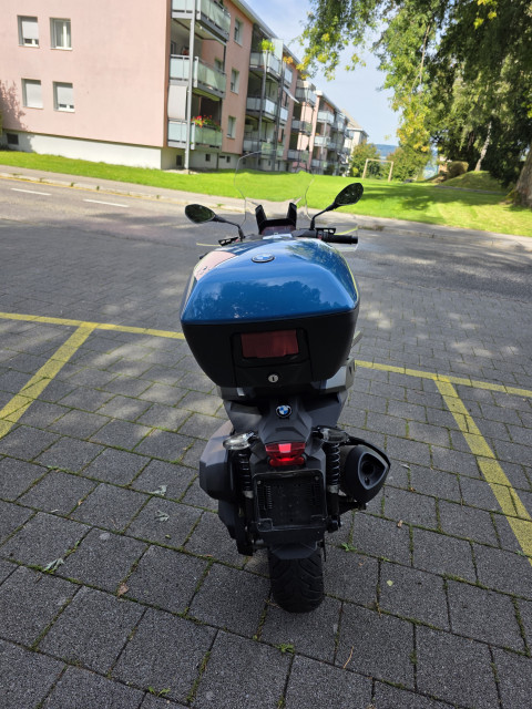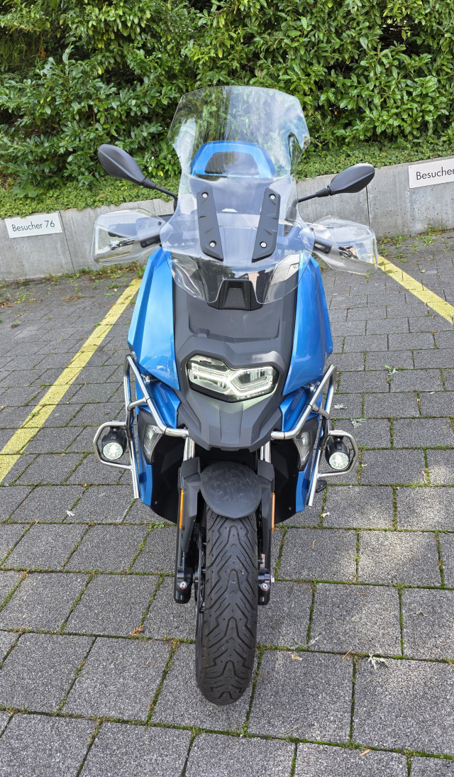 Topcase 30Liter in Fahrzeugfarbe lackiert, Rückepolster, Gepäckbrücke, Scooter-Mantel, 2 Fahrzeugschlüssel und Seitenständerauflage mit verstellbaren schwarzen Sportbremshebeln, Handschutz, Grosse und Kleine Scheibe
