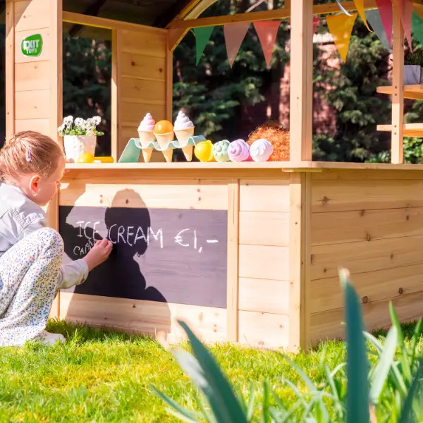 Zaun, Bretter mit Kreidefarbe und ein pfiffiges Dach mit Rollenspiel-Rad bringen das EXIT Hika Holzspielhaus rundum zur Geltung! Der