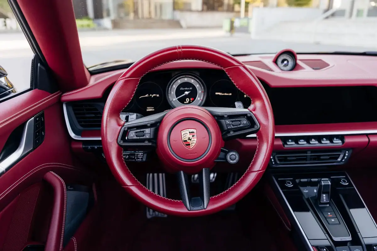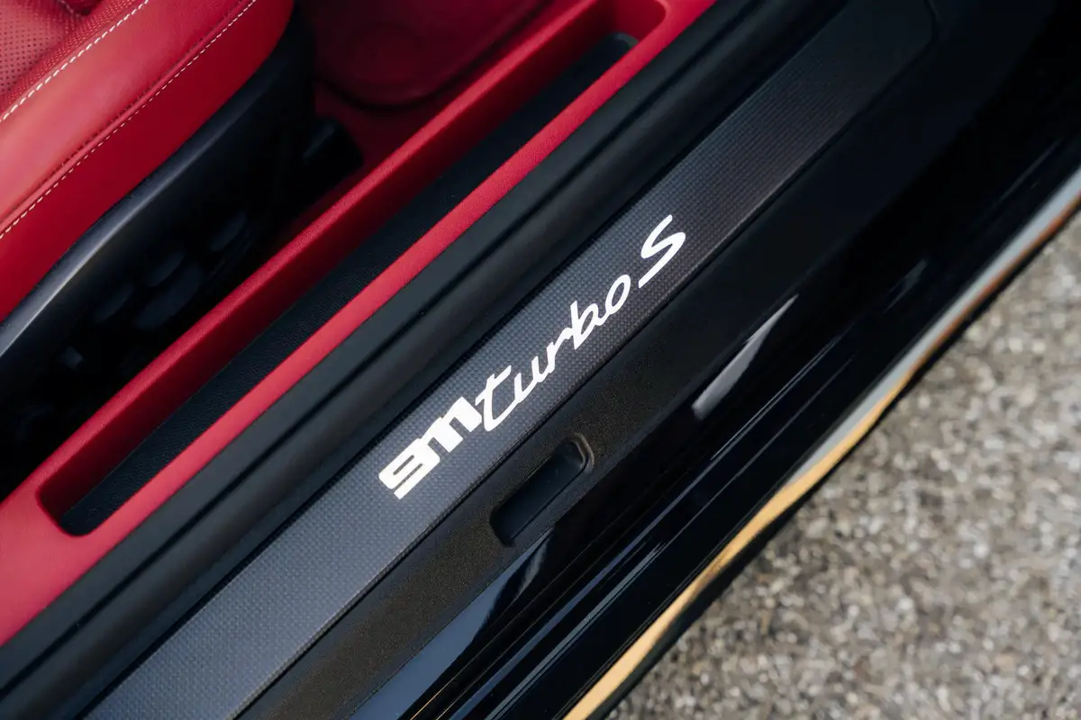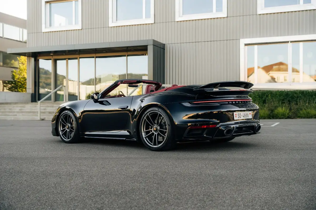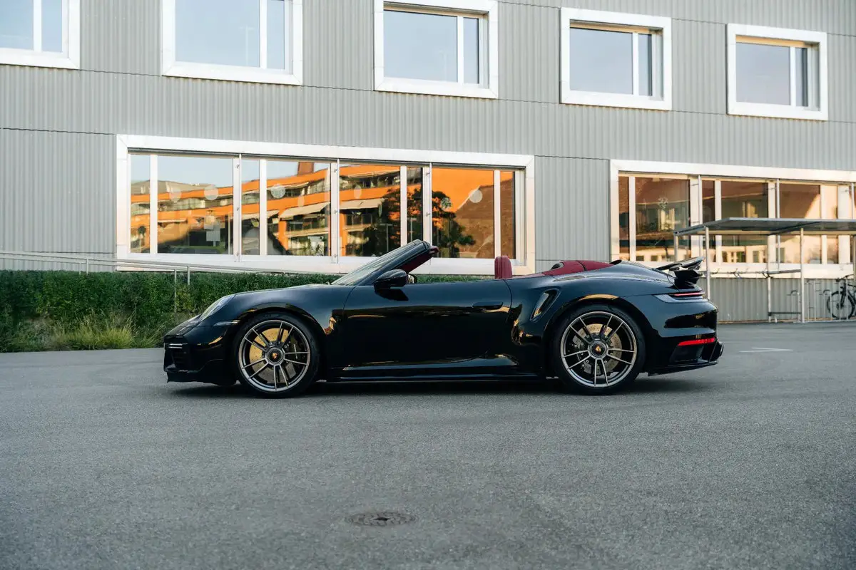 Zum Verkauf steht ein Porsche 911 Turbo S Cabriolet, Erstzulassung 2024, in Schwarz mit rotem Verdeck und exklusiver Bi-Color Lederausstattung Bordeaux.