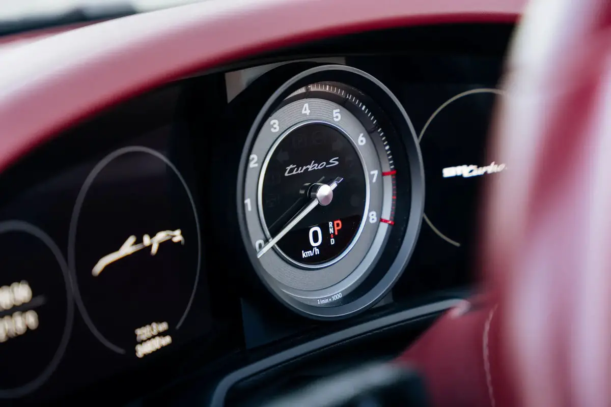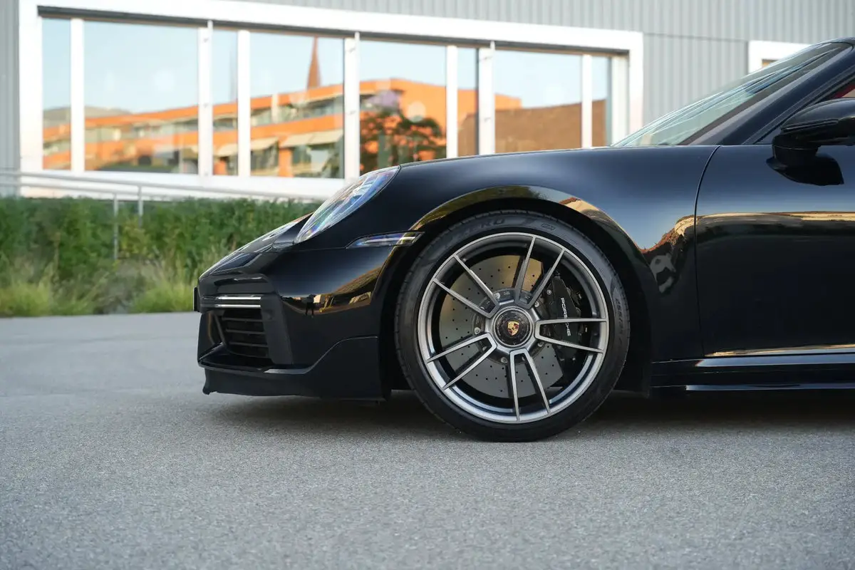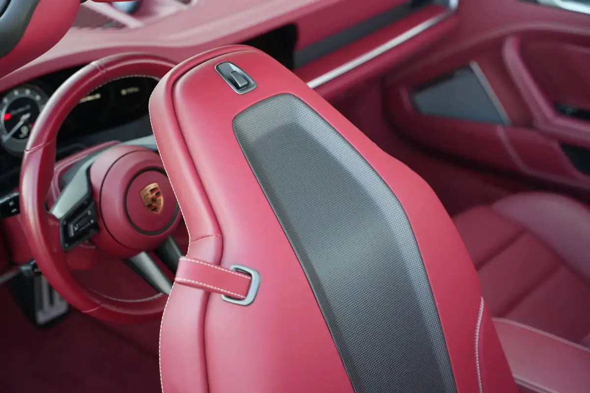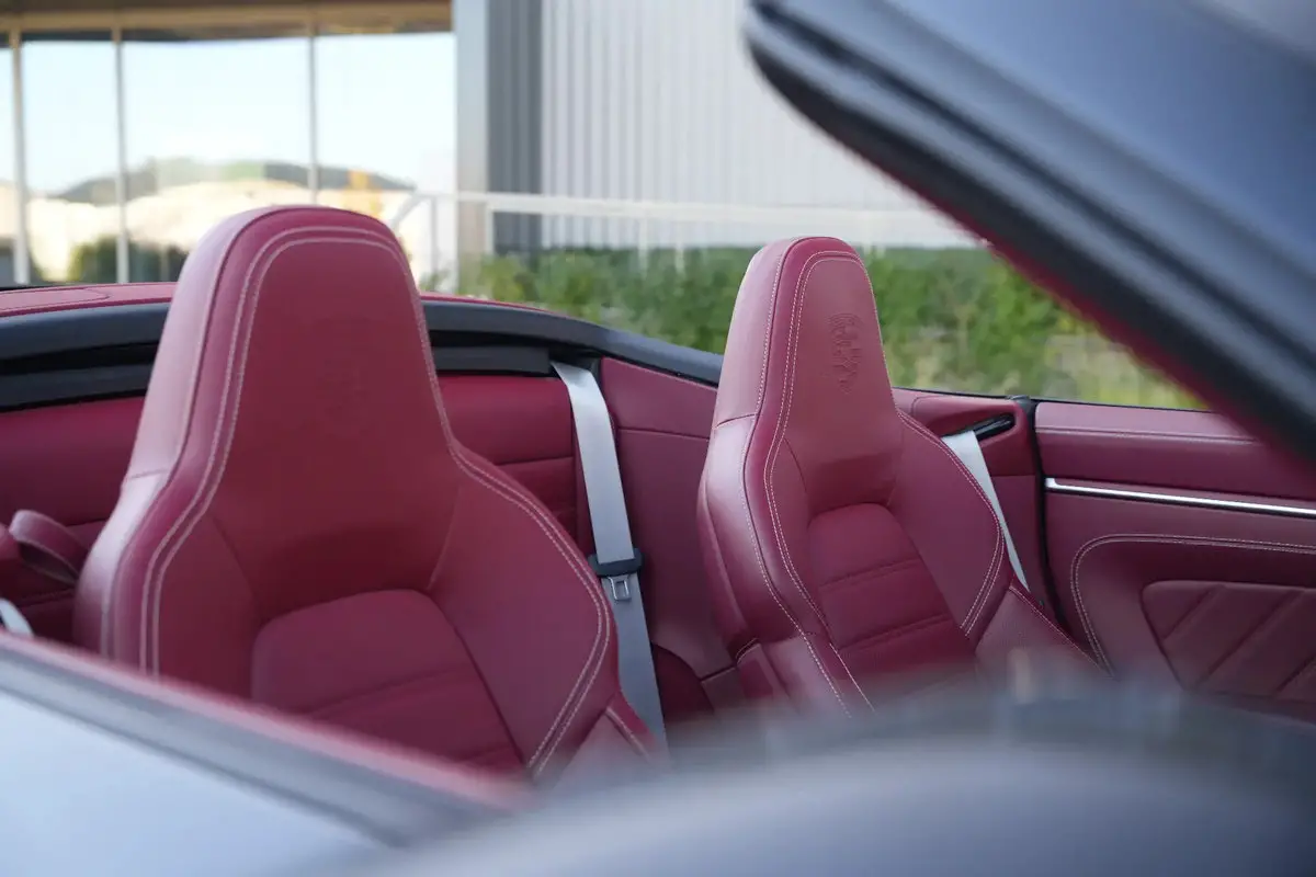 Zum Verkauf steht ein Porsche 911 Turbo S Cabriolet, Erstzulassung 2024, in Schwarz mit rotem Verdeck und exklusiver Bi-Color Lederausstattung Bordeaux.