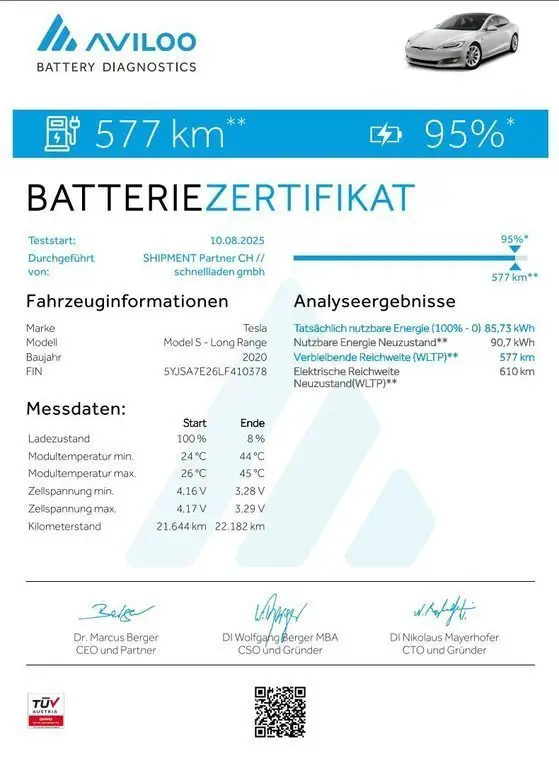 - Batterie mit AVILOO-Zertifikat erstellt am 10.08.2025, 95% SoH