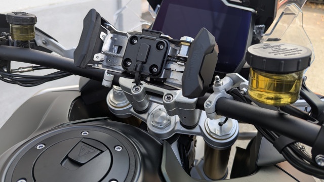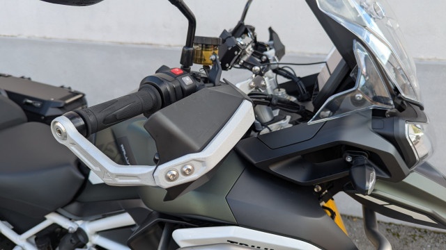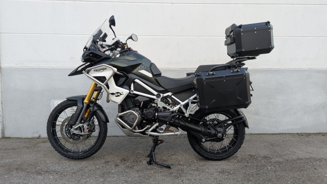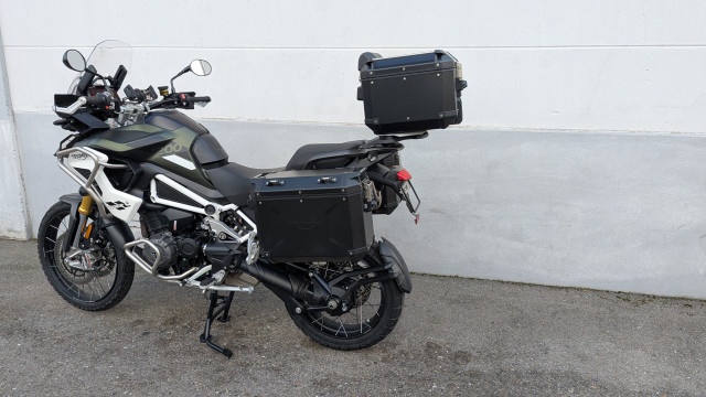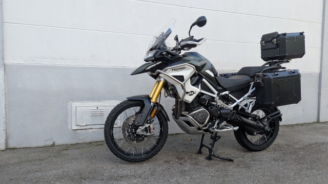 Die Tiger ist Serienmässig schon mit allem Zubehör, dass man sich nur wünscht ausgestattet worden. Ergänzt wurde die Ausstattung noch mit einem Triumph Trekker TopCase mit 42L und den passenden Triumph Trekker Seitenkoffern mit je 37L. Falls es mal etwas härter zu geht, sind die stabilen Touratech Handschützer montierte. Neben dem Serienmässigen Connectivity System ist die Tiger für ein Garmin Zümo XT Navi vorbereitet. Dieses ist mit dem Touratech Navi-Käfig gegen Langfinger geschützt.
