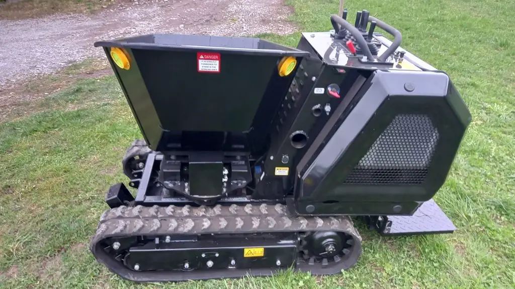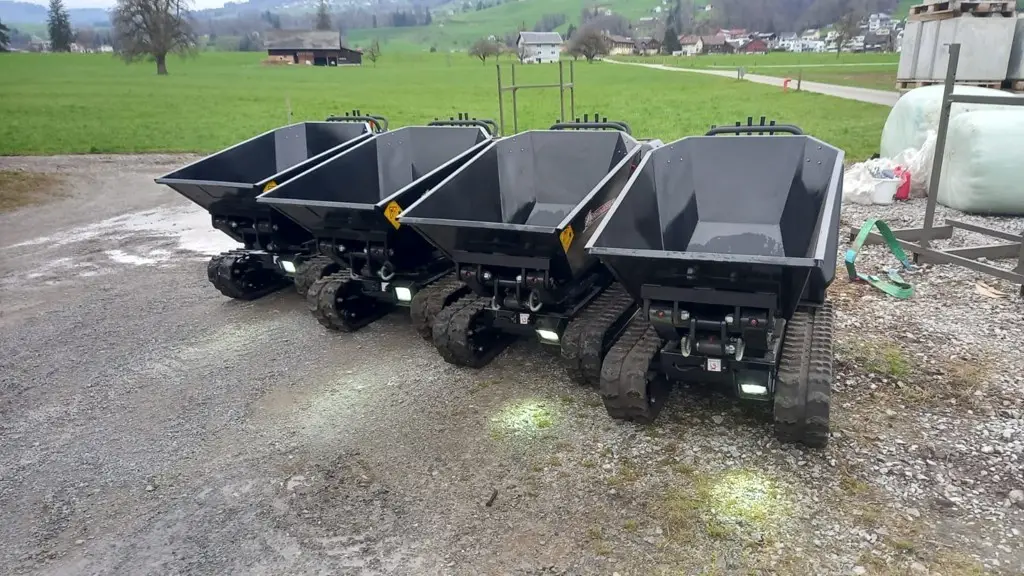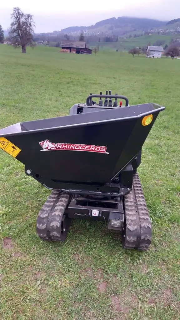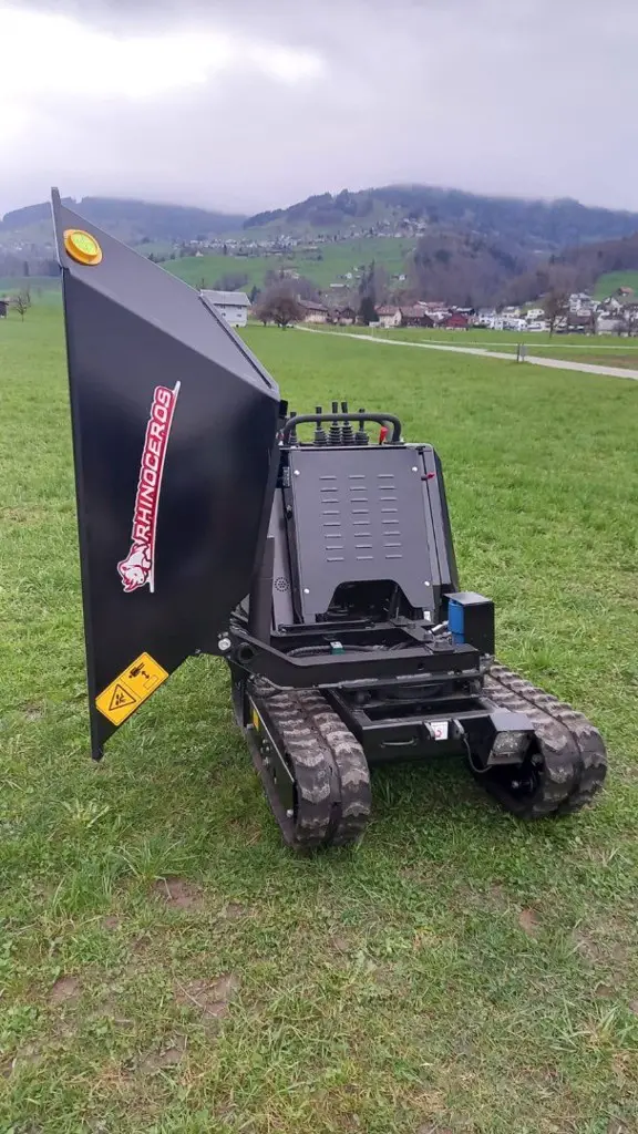 Der neue Dumper von Rhino hat eine Drehmulde, zwei Fahrstufen, Ölkühler, Scheinwerferlicht und Ladestation für das Händi.