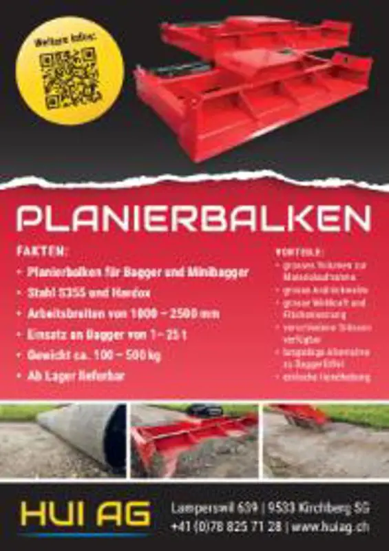 Die Hui AG erweitert ihr Sortiment um Planierbalken. Wir bieten sowohl Planierbalken mit Andrückwalze als auch Zwei-Wege-Planierbalken ohne Andrückwalze, um grössere Materialmengen effizient zu bewegen.
