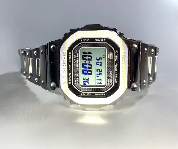 Die GMW-B5000 ist die Full Metal-Version der legendären DW-5000C, der allerersten G-SHOCK aus dem Jahr 1983. Alle äusseren Komponenten, darunter Armband, Gehäuse und Bodendeckel sind komplett aus massivem Edelstahl gefertigt und aufwendig hochglanzpoliert. Im Kontrast zum spiegelnden Gehäuse wurde die Lünette mit einem Hair-Line Finish matt gebürstet. Dabei bleibt die G-SHOCK ihrer Markenphilosophie treu, absolut tough ist sie dank Resin und Alpha Gel, die das Modul vor Stössen und Erschütterungen schützen. Technisch ist die GMW-B5000 der ersten G-SHOCK um Längen voraus: Ausgestattet mit Bluetooth®-Technologie verbindet sich die GMW-B5000 mit der CASIO WATCHES App auf dem