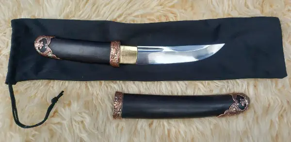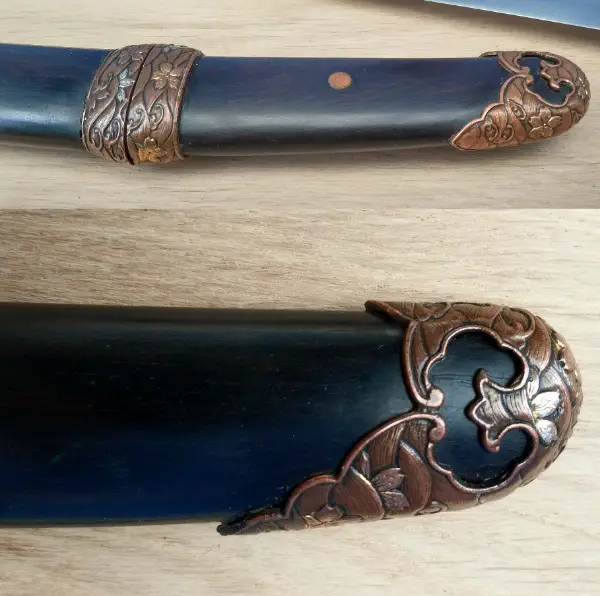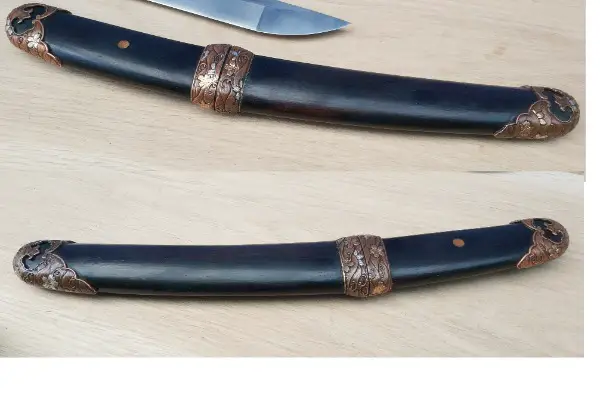 Ebenholz. Die hochwertigen Monturen sind aus dreifarbigem Messing. Die Länge mit Scheide ist ca. 30cm, ohne ca. 27cm und die der Klinge 12.5cm. Die Klingendicke ist 6.3mm bis 4.8mm.