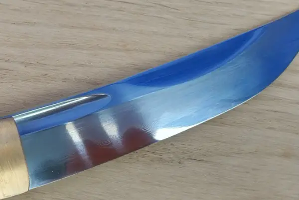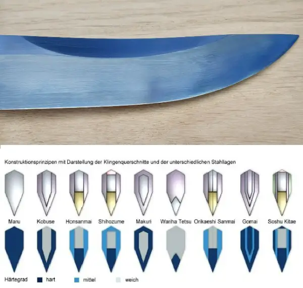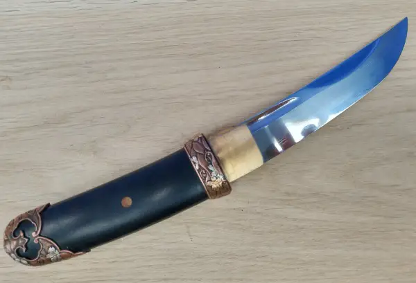 (NUR ANFRAGEN WENN SIE EIN AKTIVER NUTZER SIND) Neu und unbenutzt. Unokubi-Zukuri Tanto (Shinken) mit Honsanmai Klinge aus 1095er (hart) , 1095er und 1060er mehrfach gefaltet (mittel) und 1060er (weich) , siehe Grafik bei den Bildern. Die Klinge wurde traditionell handpoliert und differential gehärtet und nicht geätzt. Hamon (Härteverlaufslinie) und Hada (Musterung durch das Falten des Stahls) sind dezent sichtbar. Der Griff und die Scheide sind aus poliertem, asiatischem