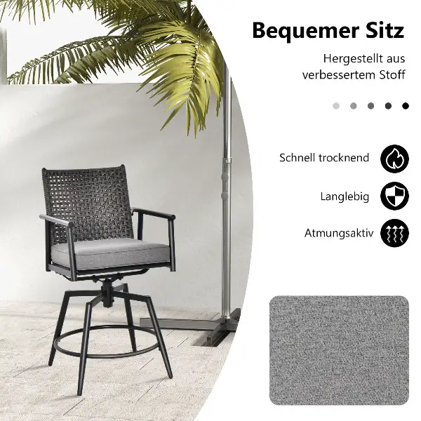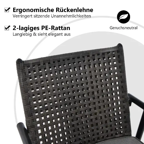 Barhocker-Set von 2 verfügt über ergonomische Rückenlehnen, die Ihren Rücken unterstützen und Unannehmlichkeiten reduzieren. Gleichzeitig verfügt es über 2-lagiges PE-Rattan, das nicht nur geruchsfrei und langlebig ist, sondern auch eine elegante Atmosphäre schafft.